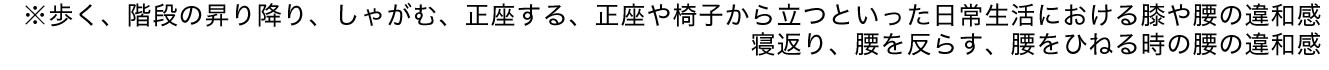 ※歩く、階段の昇り降り、しゃがむ、正座する、正座や椅子から立つといった日常生活における膝や腰の違和感、寝返り、腰を反らす、腰をひねる時の腰の違和感