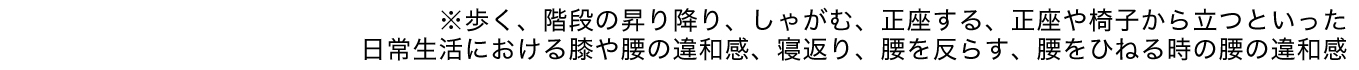※歩く、階段の昇り降り、しゃがむ、正座する、正座や椅子から立つといった日常生活における膝や腰の違和感、寝返り、腰を反らす、腰をひねる時の腰の違和感